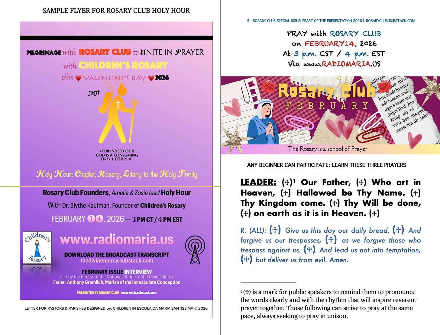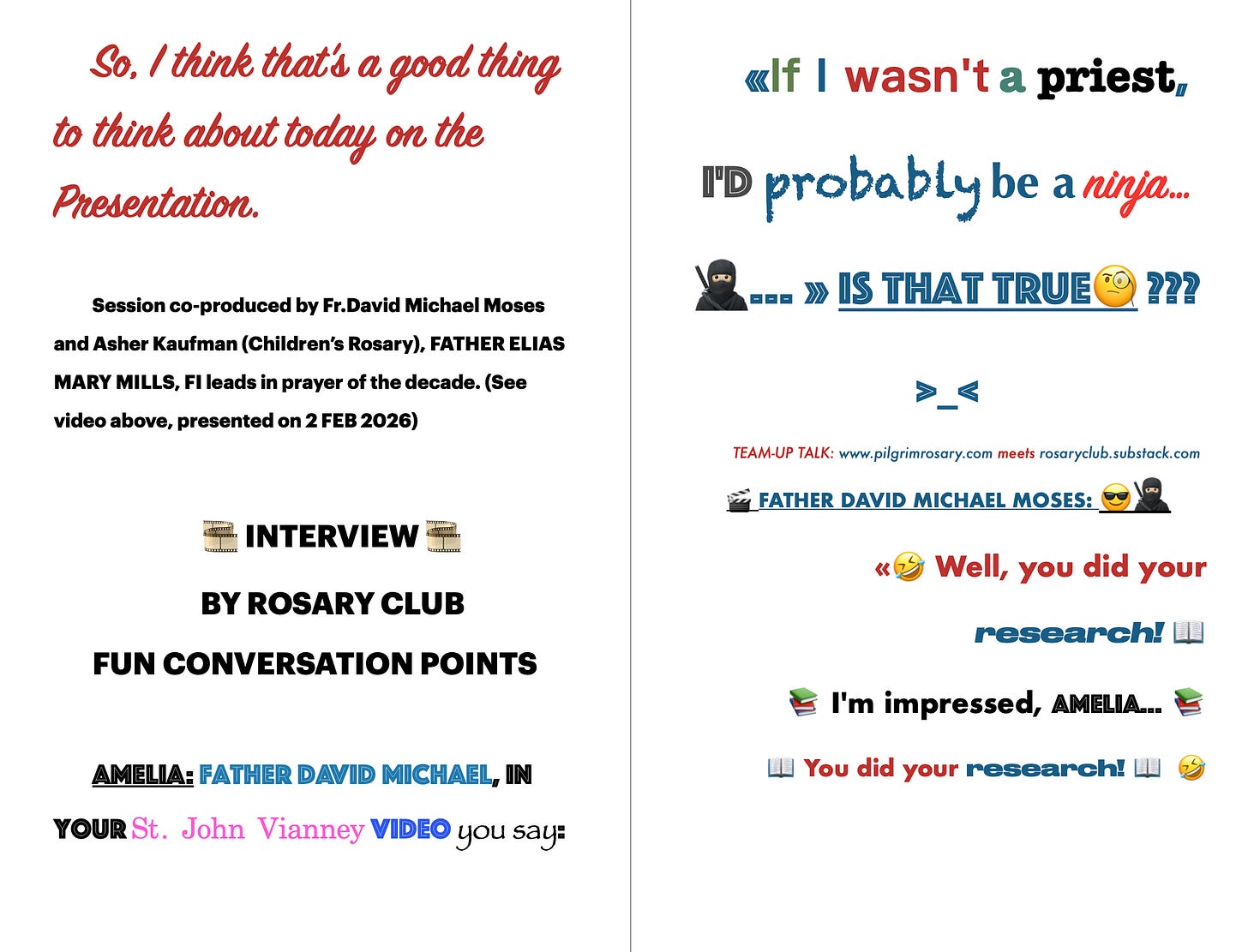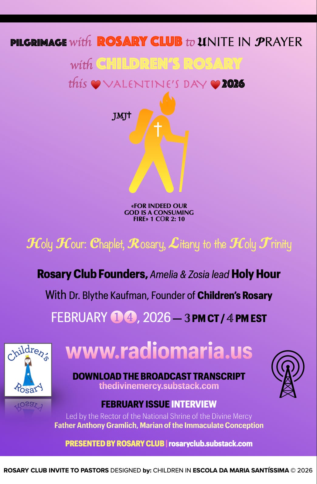 SEE THE BROADCAST OF THE ABOVE SCRIPT HERE: It is a trailer for the Feb. 2, 2024 session led by Amelia and Asher, session co-produced by Father David Michael Moses, Founder of Pilgrim Rosary USA. VIDEO PRODUCED by AMELIA, 2026 | FEB 2 with support from Dan, Godric, Fr. Nuno, Fr. Elias, Asher, Fr. David Michael, Fr. Peter, Fr. Chris, Dr. Blythe Kaufman, Izzy, Therese.
